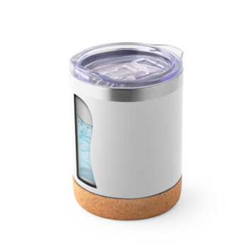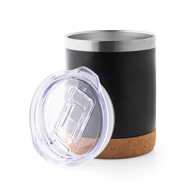 Bicchiere da viaggio termico con doppio corpo in acciaio inox con finitura opaca e base in sughero. Contiene un coperchio trasparente con chiusura scorrevole. Capacità fino a 400 ml.