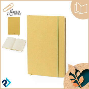 Block notes A5 con copertina rigida realizzata con materiali derivati dalla frutta. All’interno 80 fogli a righe, con segnalibro ed elastico coordinati.