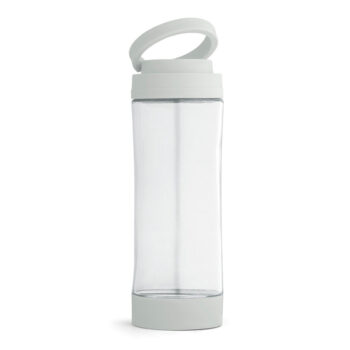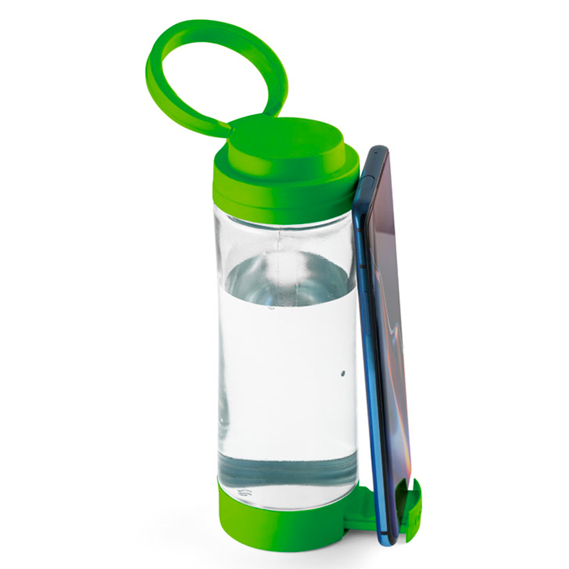 Borraccia sportiva in vetro con coperchio a vite in PP. Contiene supporto per smartphone e maniglia per un facile trasporto. Capacità fino a 390 ml.