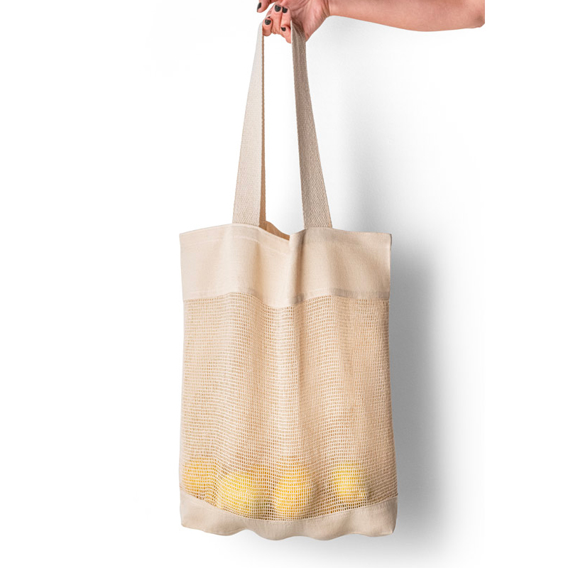 Borsa in 100% cotone (180 g/m²) con rete in 100% cotone sul davanti. Manici in fettuccia da 65 cm.