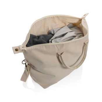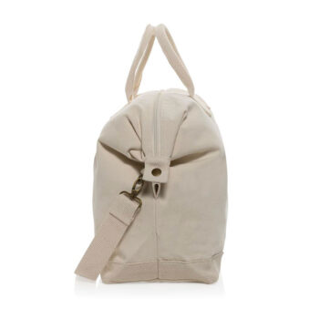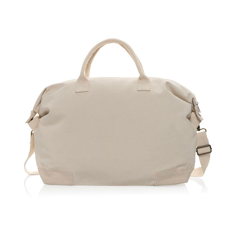 Questa borsa weekend deluxe è una soluzione elegante e a basso impatto, realizzata in tela di cotone riciclato da 500 g/m². Presenta splendidi dettagli, finiture in ottone e uno spazioso scomparto principale.
