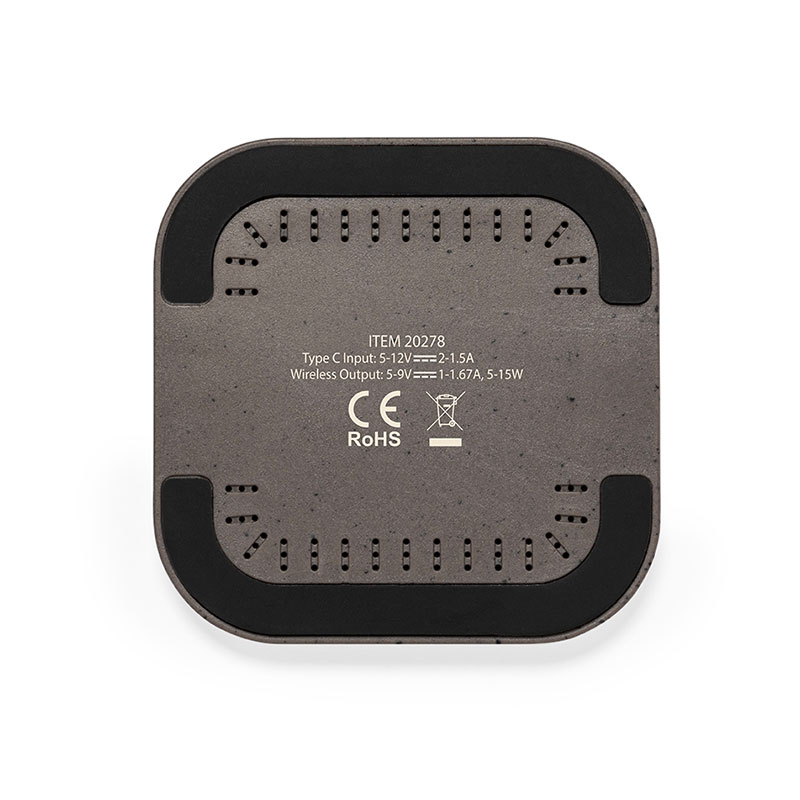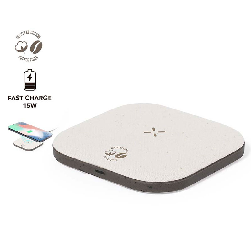 Caricatore wireless realizzato in fibra di caffè e cotone riciclato. Base antiscivolo e compatibile con i dispositivi dotati di tecnologia di ricarica Qi. Capacità di ricarica di 15W, con cavo nero di tipo C incluso. Con loghi in fibra di caffè e cotone riciclato. Presentato in un’attraente scatola dal design kraft.