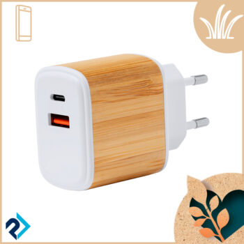 Caricatore da parete USB a ricarica rapida con struttura in plastica ecologica di paglia di grano e bamboo, 1 porta USB, 1 porta USB-C e spina europea a 2 poli.