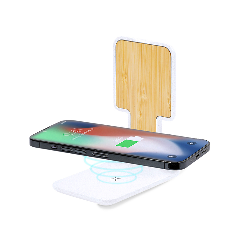 Caricatore supporto wireless integrato da 15W. Pieghevole e realizzato in una combinazione di fibra di grano e bamboo. Regolabile in altezza, con protezione in gomma antiscivolo sulla base di ricarica e supporto. In una sobria finitura bianca e con base di ricarica in bamboo. Cavo di tipo C incluso e manuale di istruzioni in spagnolo e inglese. Presentato in un’attraente scatola di design.