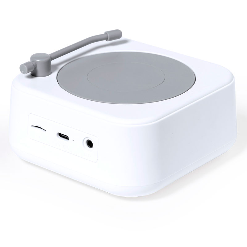Cassa Bluetooth® a forma di giradischi originale, dimensioni compatte e potenza di 5W. Batteria al litio da 800 mAh, con cavo di ricarica Type-C incluso e indicatore luminoso dello stato di carica. Funzione vivavoce e radio FM, con slot per schede micro SD fino a 32 GB e ingresso ausiliario per jack da 3,5 mm. Realizzato in resistente ABS bianco con accenti grigi e presentato in una scatola individuale dal design kraft, con manuale di istruzioni in inglese e spagnolo.