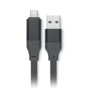 Cavo da 60W con involucro in ABS riciclato, con portachiavi e supporto per telefono incorporati. Ingresso: 2-in-1 Tipo-C e Tipo-A. Uscita: Tipo-C e micro-B (2 in 1 pin). Lunghezza del cavo: 26 cm.