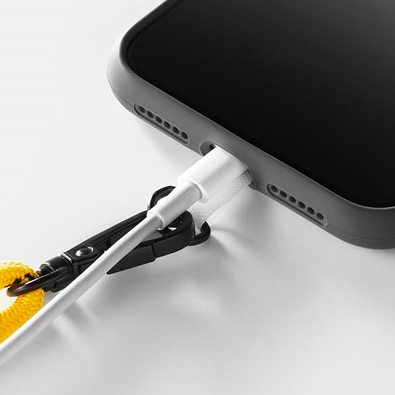Cordino regolabile bicolore in RPET con motivo alla moda è dotato di un supporto per telefono patch in tessuto di poliestere con anello in metallo.