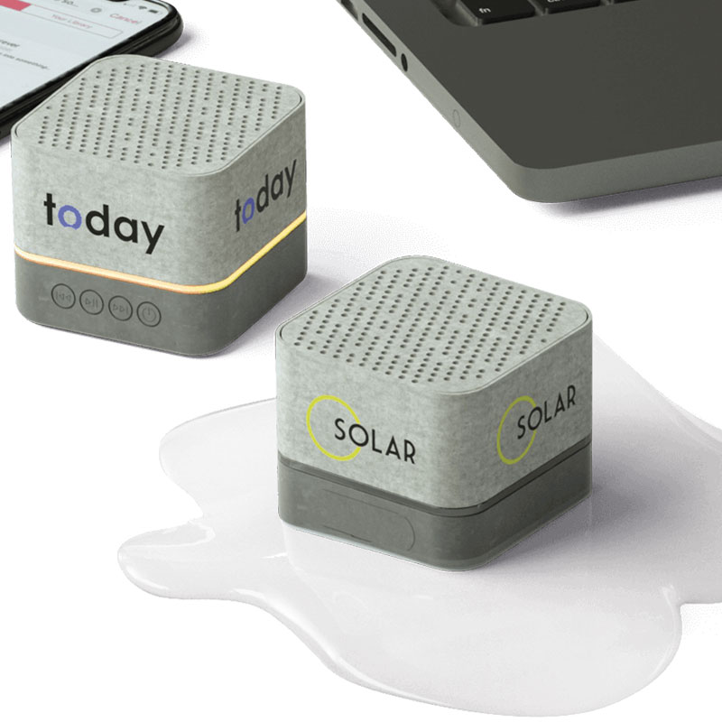 Speaker Bluetooth in fibra di grano con base in silicone resistente all’acqua. Sul bordo in silicone si trovano i pulsanti per l’accensione e la gestione dei brani e, sul lato opposto, la porta micro USB (a cui collegare il cavo per la ricarica) ed un alloggiamento per la scheda di memoria. Il tutto è protetto da una linguetta in silicone che impedisce a schizzi d’acqua o umidità di rovinare lo speaker. La batteria interna ricaricabile ha una capacità di 300 mAh ed un’autonomia di circa 3 ore di ascolto. Una volta collegato allo smartphone o altro dispositivo, il Bluetooth assicura un raggio d’azione di 10 metri. Un Led luminoso visibile su tutti e quattro i lati segnala quando la cassa è in funzione.