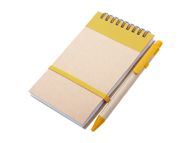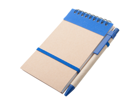 Blocco note a spirale con 70 fogli a righe, copertina in carta riciclata e penna a sfera in cartone riciclato con refill blu.