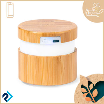 Lampada multifunzionale in bamboo. Con cassa Bluetooth® 5.0 da 3W e caricatore wireless da 15W. 2LED. Compatibile con i dispositivi mobili a ricarica wireless, con cavo di ricarica di tipo C e viene presentata in un’attraente scatola dal design kraft.