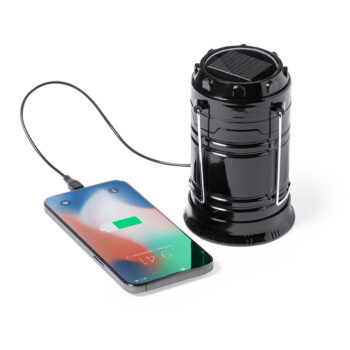 Lampada powerbank a energia solare con batteria ausiliaria integrata da 1.200 mAh e torcia. Realizzata in resistente materiale ABS, con maniglie pieghevoli in metallo. Funzioni: