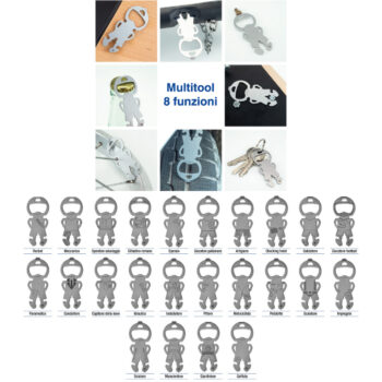 Omino Jack in acciaio mini tool multifunzione. Originale e con 8 funzioni in un unico prodotto: cacciavite a lama piatta, occhiello portachiavi, apribottiglie, chiave a 6 punte, leva chiodi,misuratore di profondità del battistrada del pneumatico, chiave tendiraggi, gettone carello spesa. Personalizzazione con logo inciso un lato nell’acciaio e card personalizzata in quadricromia f.to chiuso 85x55mm. Tanti personaggi diversi a scelta, più di 45 diversi.