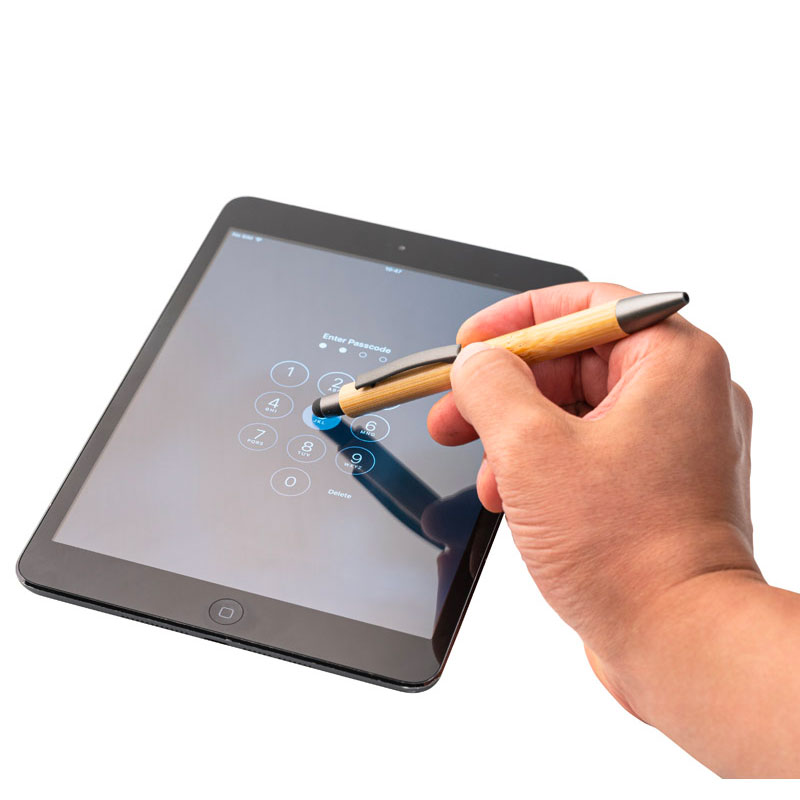 Penna a sfera touch in bamboo con clip in metallo, elementi in PP e finitura opaca. Caratterizzata da punta touch in metallo grigio, per un contatto migliore con i touch screens. Inchiostro nero.