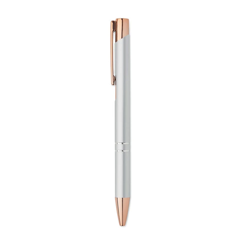 Penna Bern Rose push button in alluminio riciclato e con dettagli rose gold. Inchiostro blu.