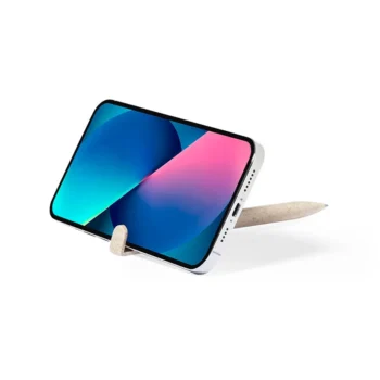 Penna con supporto smartphone. Penna elegante e pratica realizzata in fibra di grano e ABS. Meccanismo a pulsante, con porta clip integrato per dispositivo mobile. In inchiostro blu e con logo Wheat Straw sulla parte superiore della penna.