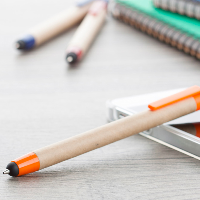 Penna Tempe in carta riciclata con gommino capacitivo per touch screen, clip e puntale colorati in plastica coordinati.