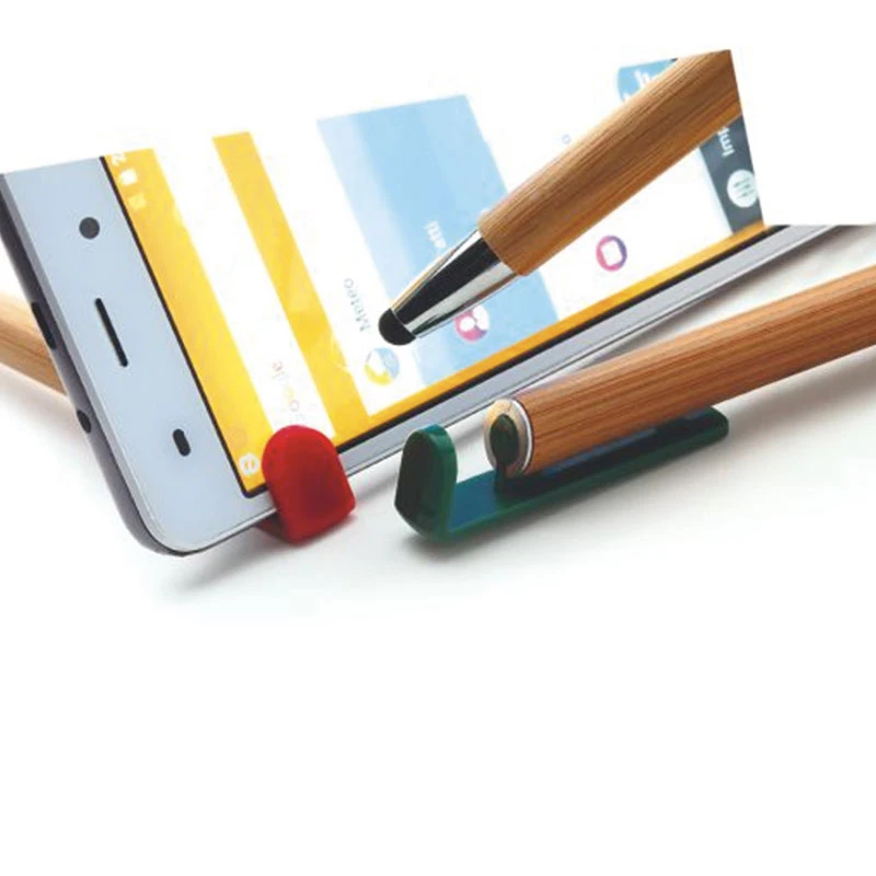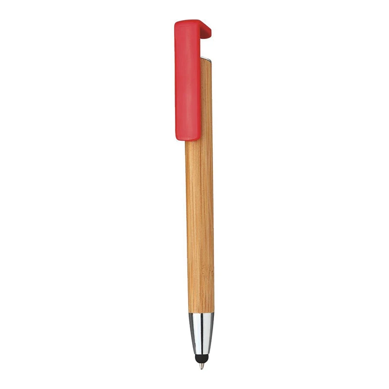 Penna a sfera touch in bamboo. Clip in plastica funzionalità supporto cellulare.