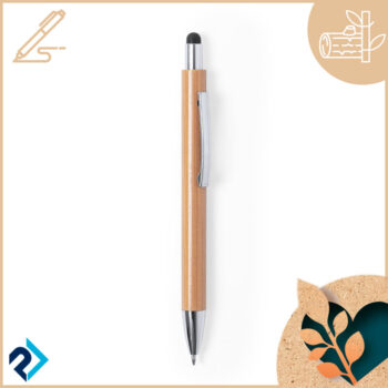 Penna touch della linea Nature, con corpo in bamboo e accessori cromati, con puntatore nero. Meccanismo a pulsante, clip metallica e cartuccia jumbo con refill blu.