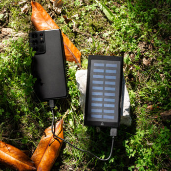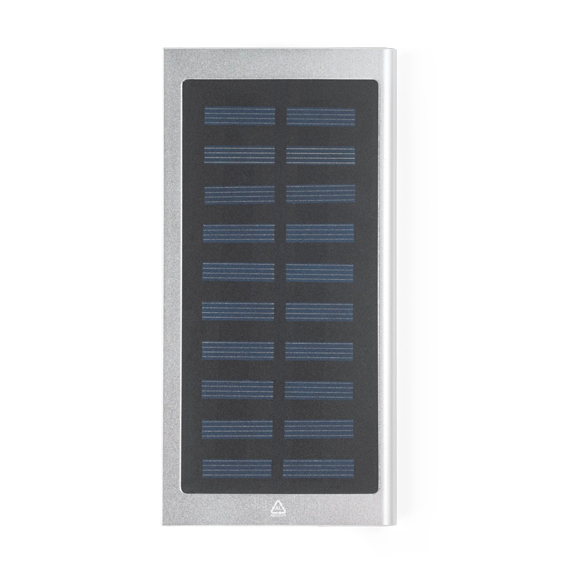 Powerbank portatile in alluminio (100% riciclato) e batteria al litio. La batteria comprende un pannello solare e una torcia. Ha una capacità di 8.000 mAh e una durata di oltre 500 cicli. È dotata di ingresso USB-C e di uscita USB-C e USB-A per la ricarica della batteria. Include un cavo di ricarica USB-A/USB-C da 30 cm. Ideale per le situazioni di emergenza.