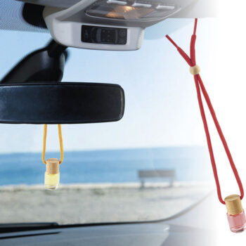 Boccetta profumatore auto in vasetto di vetro da 5 ml con tappo in legno, cordoncino in tinta e accessorio in legno.
