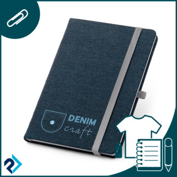 Blocco note A5 con copertina rigida foderata in tessuto denim. Questo blocco note ha 192 pagine foderate, elastico, nastro segnalibro, tasca interna e portapenne.