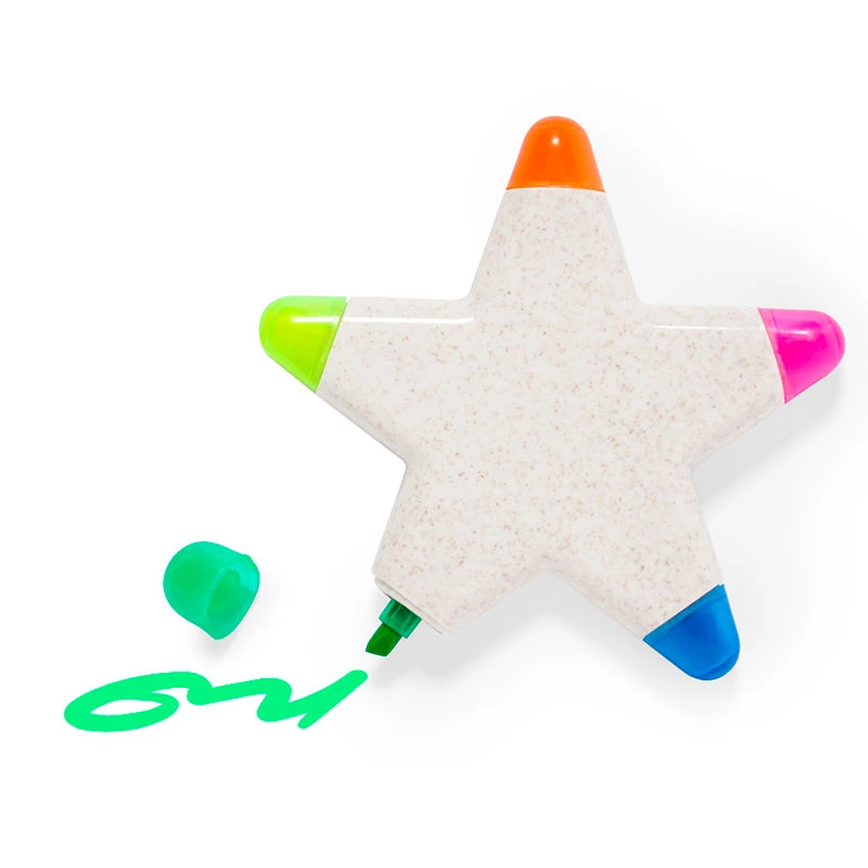 Set Evidenziatori Pentar, originale set di evidenziatori a cinque colori in fibra di grano. Con corpo a stella in finitura liscia e lucida. Con cappuccio trasparente in tinta con l’evidenziatore. Presentato in un sacchetto di carta riciclata.