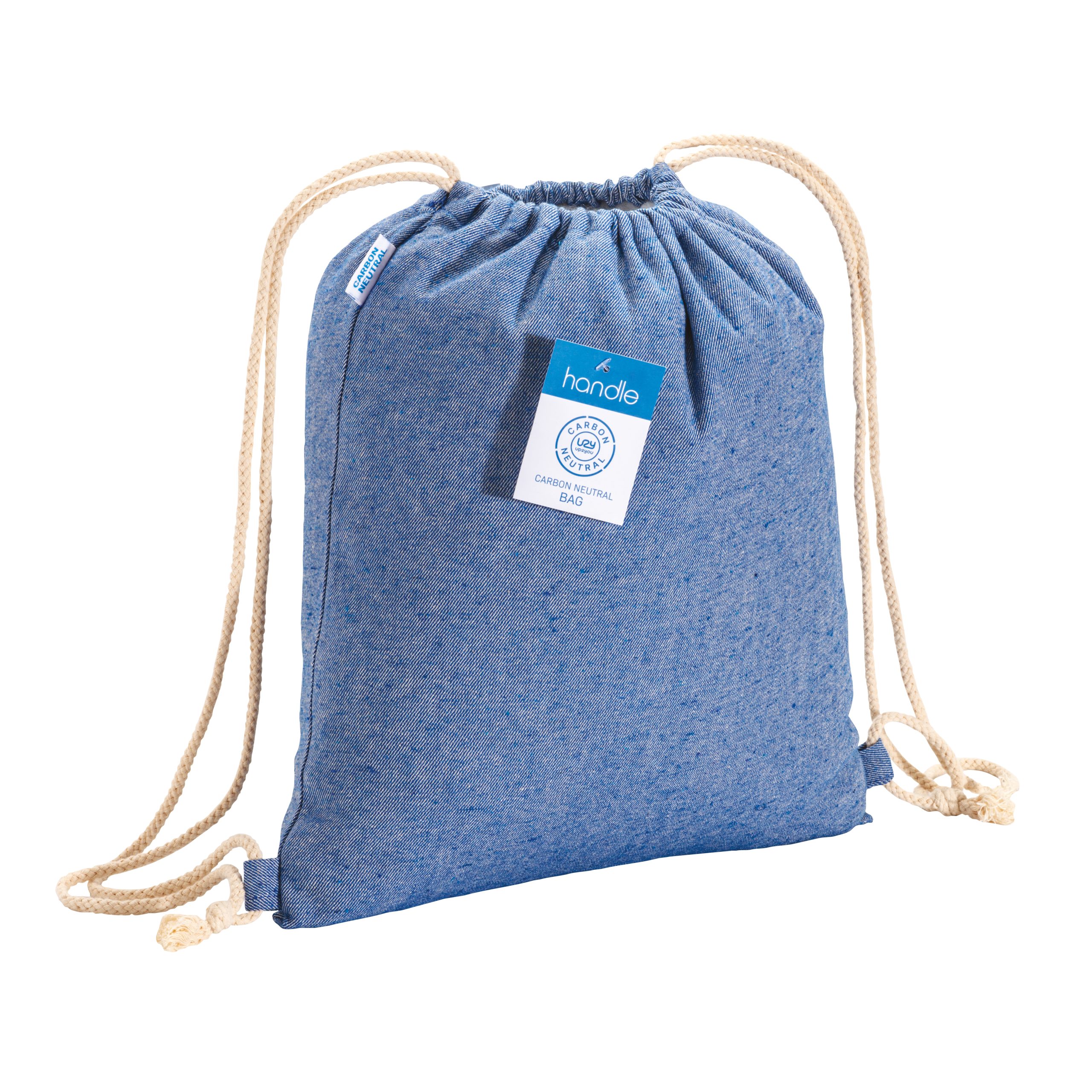 Zainetto carbon neutral in cotone riciclato con effetto mélange, chiusura a strozzo e cordini fissati con asola.